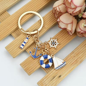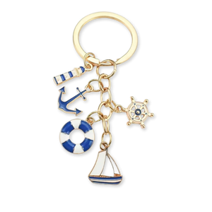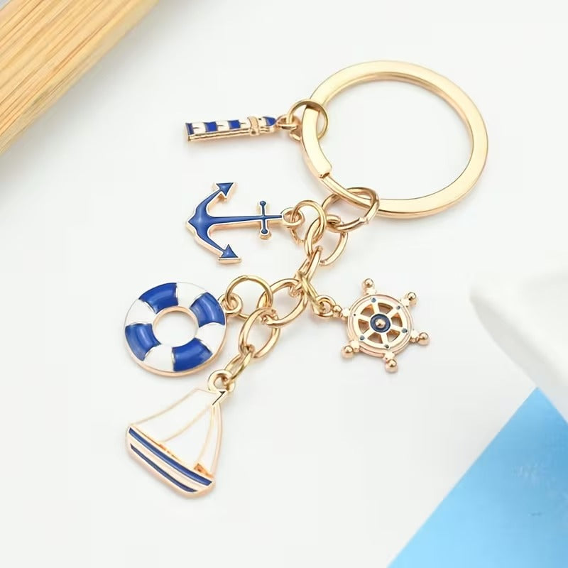 Denizciliğe dair ne varsa bu anahtarlıkta topladık. Sadece bir çapa veya dümen değil; yol gösteren deniz feneri ve özgürlüğü simgeleyen yelkenli tekne de bu zengin tasarımda. Gold metalin sıcaklığı, klasik lacivert-beyaz minelerle (Navy Blue) birleşerek zamansız bir yaz şıklığı sunuyor.