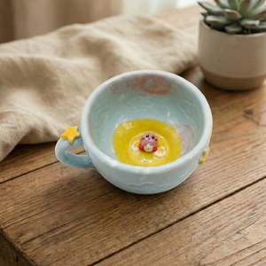 Sıradan kupaların aksine, bu tasarımın içinde sizi bekleyen küçük bir dost var. İçeceğinizi yudumladıkça ortaya çıkan 3 boyutlu el yapımı figür, size "yalnız değilsin, hikayen burada" diyor. Yüksek kaliteli seramik yapısı, içeceğinizin ısısını ideal sürede korurken, el emeğiyle şekillenen ergonomik tutuşu avucunuza tam oturur.