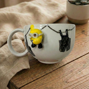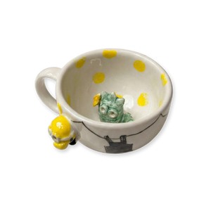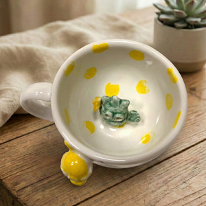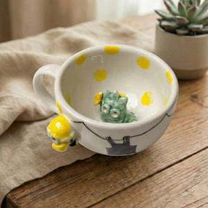 Sıradan kupaların aksine, bu tasarımın içinde sizi bekleyen küçük bir dost var. İçeceğinizi yudumladıkça ortaya çıkan 3 boyutlu el yapımı figür, size "yalnız değilsin, hikayen burada" diyor. Yüksek kaliteli seramik yapısı, içeceğinizin ısısını ideal sürede korurken, el emeğiyle şekillenen ergonomik tutuşu avucunuza tam oturur.