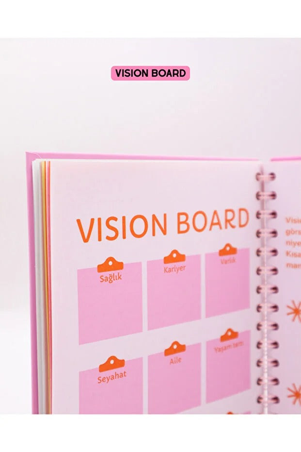 Vision Board (Vizyon Panosu): Sağlık, Kariyer, Varlık, Seyahat, Aile ve Yaşam Amacı gibi hayatınızın temel alanlarını görselleştirmeniz için özel ayrılmış bölümler.