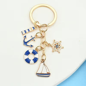 Denizciliğe dair ne varsa bu anahtarlıkta topladık. Sadece bir çapa veya dümen değil; yol gösteren deniz feneri ve özgürlüğü simgeleyen yelkenli tekne de bu zengin tasarımda. Gold metalin sıcaklığı, klasik lacivert-beyaz minelerle (Navy Blue) birleşerek zamansız bir yaz şıklığı sunuyor.